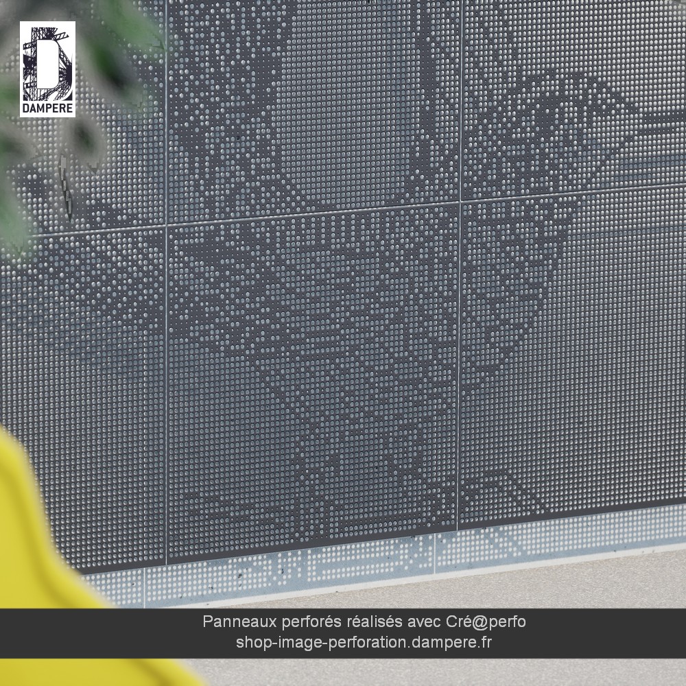 La transformation de l’image noir et blanc pour en faire une tôle perforée sur mesure offre une toute nouvelle dimension au dessin. Les traits de l’oiseau gagnent en profondeur et épaisseur. Par la magie de la transparence d’un panneau perfo, nous obtenons une ombre projetée sur le mur qui augmente l’effet du motif. Selon l’orientation du soleil, l’oiseau se dédouble en ayant de nouvelles plumes dessinées sur le mur ou projetées sur le sol s’il s’agit d’un portail. La technique de perforation à commande numérique offre d’autres perceptions du motif.